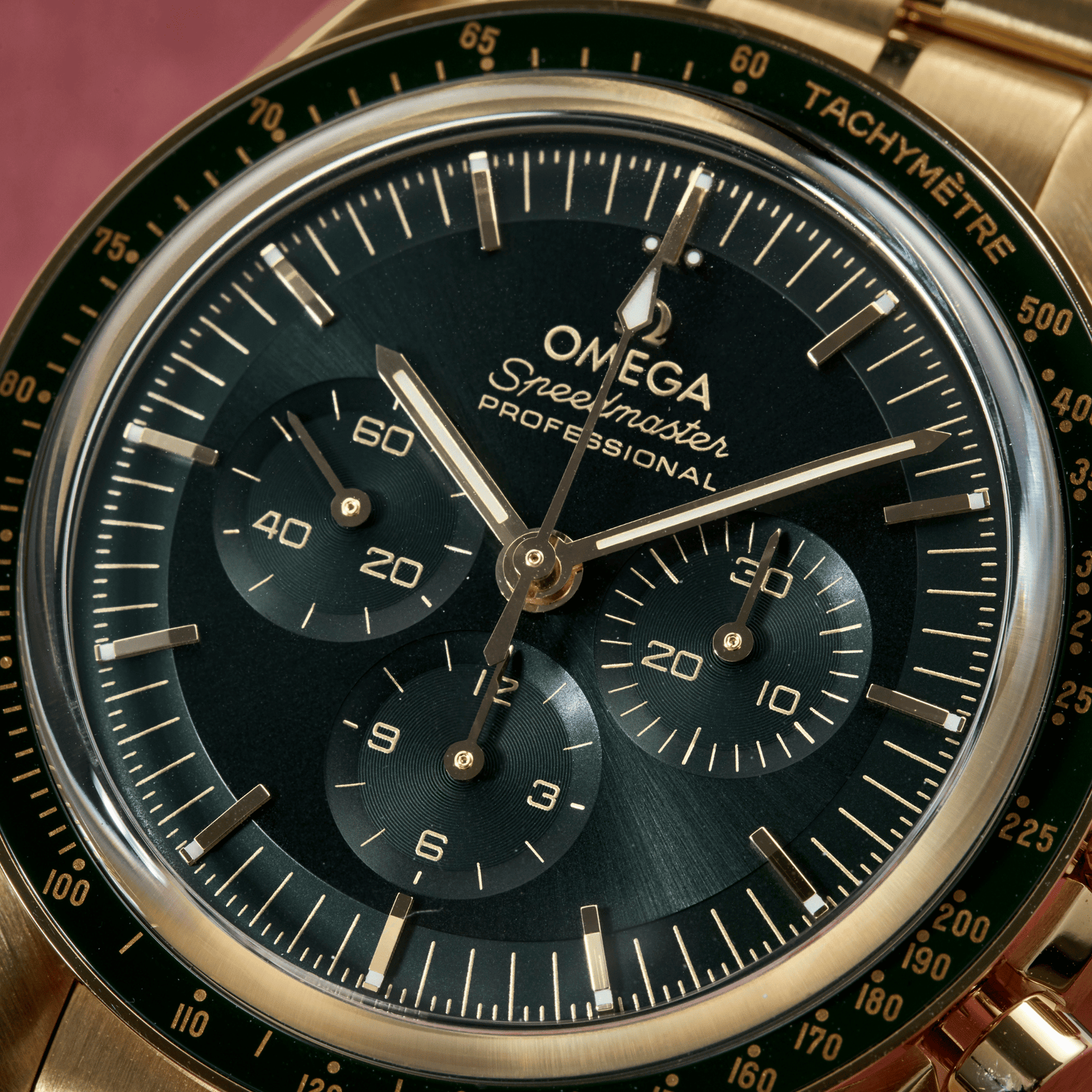 The Omega Speedmaster Moonwatch Professional 42 Yellow Gold Green Dial, reference 310.60.42.50.10.001, is a stunning reinterpretation of one of the world’s most iconic timepieces. Featuring a 42mm case crafted in luxurious 18K Moonshine Gold, this Speedmaster exudes a refined and elegant presence on the wrist. The sun-brushed green PVD “step” dial, complemented by the iconic “Moonwatch” style hands, creates a mesmerizing visual that pays homage to the Speedmaster’s legendary history. The green ceramic bezel ring, adorned with an OMEGA Ceragold tachymeter scale and the famous dot over 90, adds a distinctive touch to the design. The polished 18K Moonshine Gold case back features the engraving “FIRST WATCH WORN ON THE MOON,” a testament to the Speedmaster’s unparalleled accomplishments in space exploration.