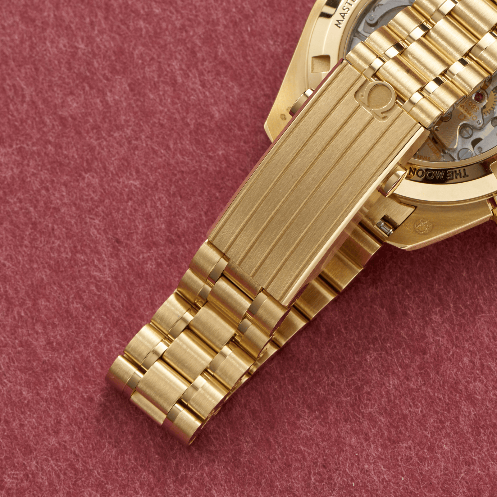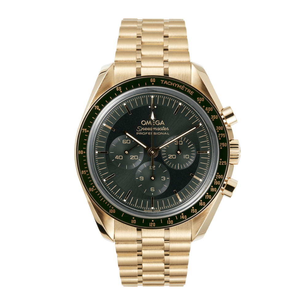 Powering this exceptional timepiece is OMEGA’s renowned Co-Axial Master Chronometer Calibre 3861, a manual-winding movement that delivers exceptional precision and reliability. Complementing the case is a matching 18K Moonshine Gold bracelet, secured by a foldover clasp for a secure and comfortable fit. This Speedmaster Moonwatch Professional not only embodies Omega’s pioneering spirit but also elevates the iconic design with luxurious materials and a captivating green color scheme, making it a true collector’s item for the discerning watch enthusiast.