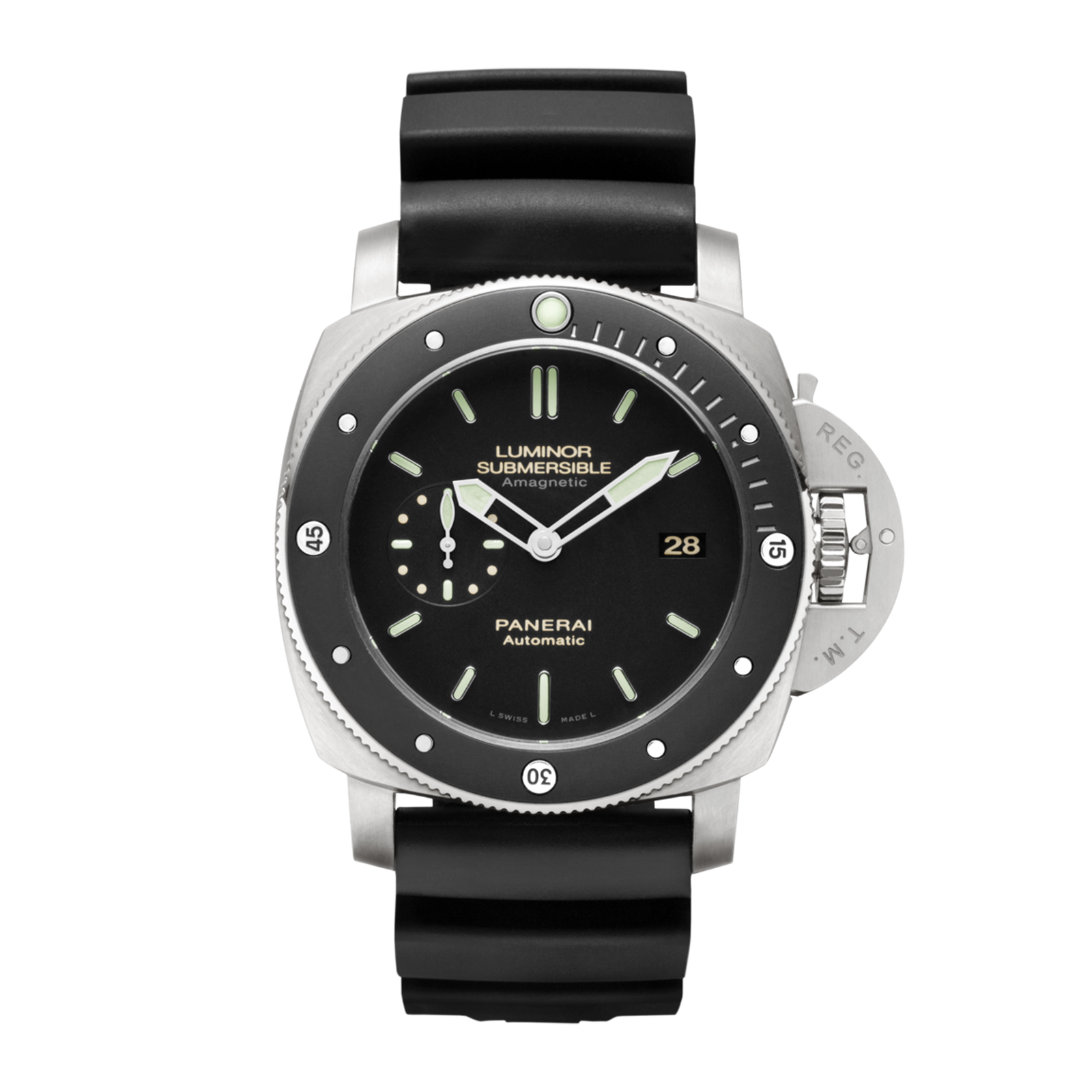 Introducing the Panerai Submersible 1950 Amagnetic Titanio Black Dial 47mm ref. PAM00389, a robust dive watch engineered for adventure. This timepiece features a substantial 47mm titanium case, offering both lightweight comfort and exceptional durability. The black dial is equipped with luminescent index markers for optimal visibility underwater, complemented by a ceramic bezel for added scratch resistance. Powered by the self-winding Calibre P.9000 movement, this watch provides a reliable 72-hour power reserve. Water-resistant up to 300 meters, the PAM00389 is designed for serious diving and aquatic activities. The watch is secured by a black rubber strap with a titanium pin buckle, ensuring a secure fit during any adventure. Launched in 2013, the Submersible 1950 Amagnetic exemplifies Panerai’s commitment to precision and innovation, making it an essential choice for enthusiasts who appreciate functionality and style in extreme conditions.Read More