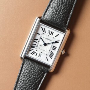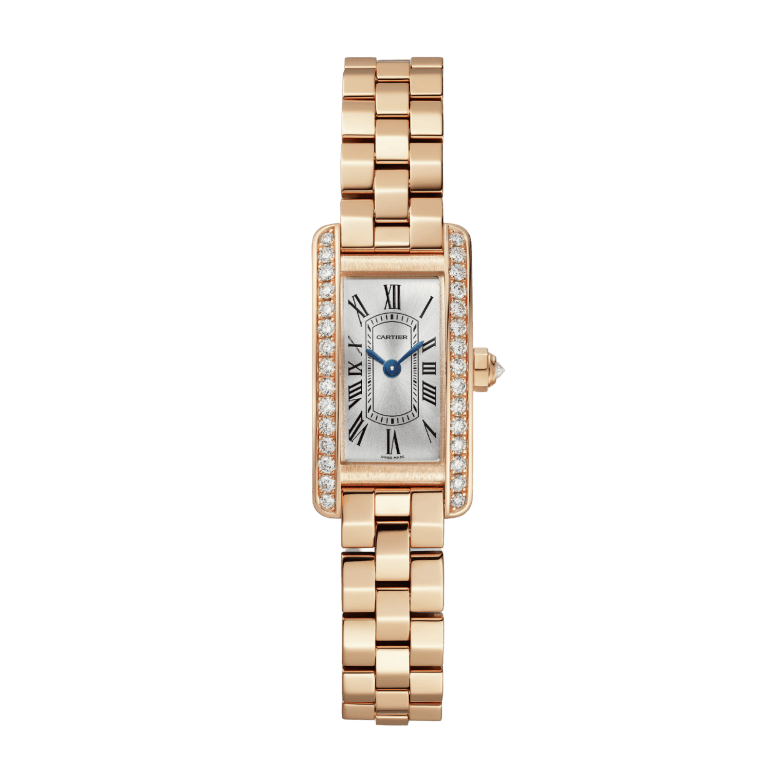 The Cartier Tank Americaine Rose Gold Diamond Silver Dial 28mm Ref. WJTA0057 presents a mini model with an elegant 18K rose gold elongated case measuring 28mm by 15.2mm and a slim 6.5mm profile, distinguished by a faceted crown and a bezel set with 31 brilliant-cut diamonds totaling 0.55 carats. The silvered sunray dial displays classic Roman numerals and blued-steel sword-shaped hands, protected by a sapphire crystal for enhanced scratch resistance. This reference is completed by a matching rose gold bracelet featuring a secure triple deployment clasp for seamless integration and comfort. Powered by a reliable quartz movement, it focuses on precise hours and minutes display with straightforward functionality and ease of maintenance. Water resistance up to 30 meters offers versatility for daily wear. Combining signature Tank design with a refined diamond setting, this watch offers understated luxury within the iconic Tank Americaine line.Read More