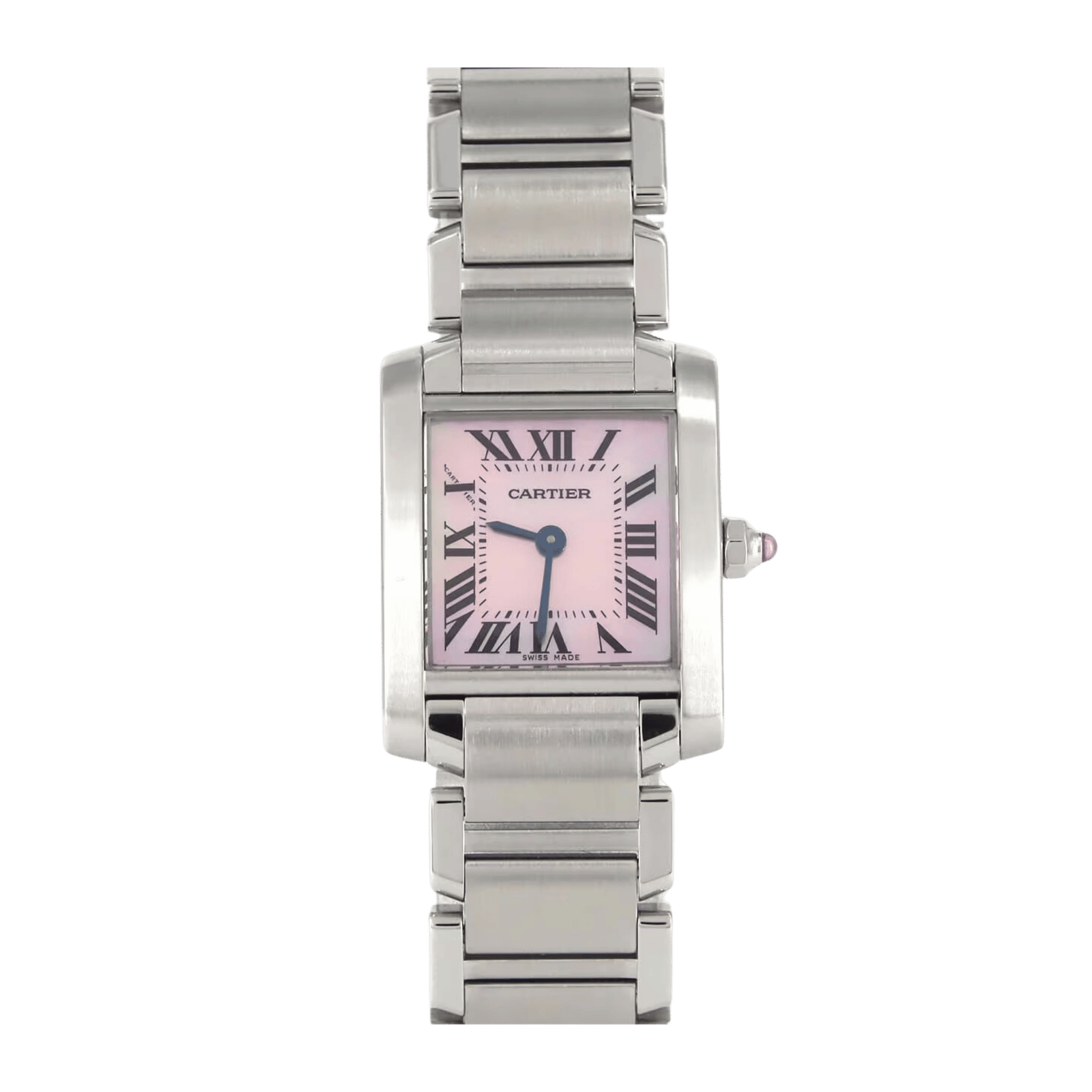 Introducing the Cartier Tank Française Steel Pink Mother of Pearl Dial 20mm ref. W51028Q3, a refined blend of classic design and modern functionality. This elegant timepiece features a 20mm stainless steel case with a lustrous pink mother-of-pearl dial, enhanced by Roman numeral hour markers for a sophisticated touch. The watch is fitted with a sapphire crystal, providing durability and scratch resistance. Powered by a reliable quartz movement, it ensures accurate timekeeping while requiring minimal maintenance. The stainless steel bracelet offers a sleek, polished look and is secured with a deployment clasp for added security and comfort. With a water resistance of up to 30 meters, the Cartier Tank Française ref. W51028Q3 is suitable for everyday wear. This watch is perfect for those seeking a stylish accessory that combines elegance with practicality, making it an ideal choice for any occasion.Read More