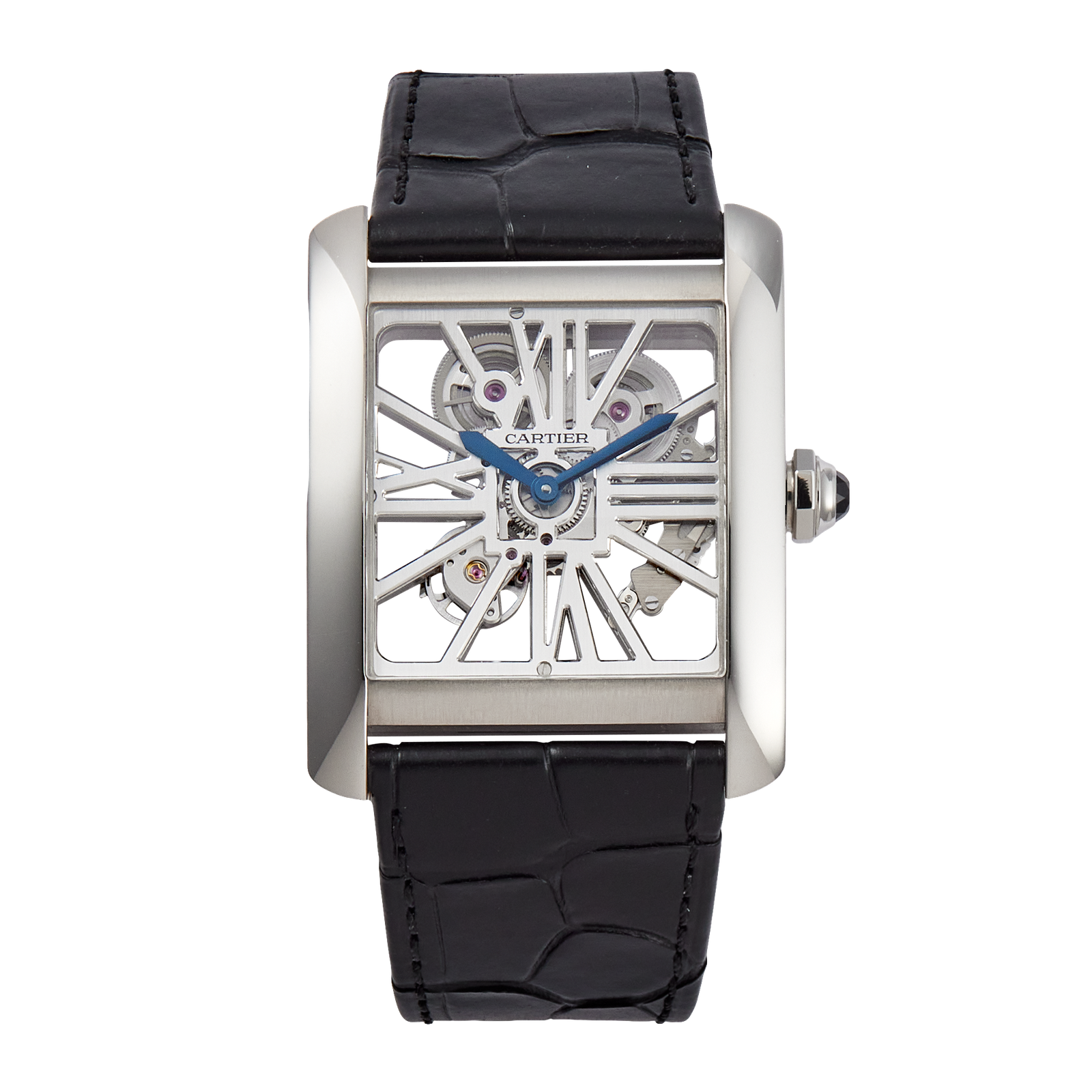 The Cartier Tank MC 34 ref. W5310026 is a timepiece that combines Cartier’s iconic design with a modern twist. The watch features a 34mm case crafted from palladium, one of the elements in the platinum group of metals, sharing many characteristics with platinum such as its white, silvery appearance and its resistance to tarnish. The standout feature is its skeleton dial, which offers a glimpse into the intricate mechanics of the watch. This transparent dial not only showcases the precision-engineered movement inside but also serves as a striking design element. Equipped with a manual winding calibre 9611 MC movement, the Tank MC 34 Palladium ensures reliable and accurate timekeeping. Its slim profile and clean lines adhere to the minimalist aesthetics of the Tank collection, while the skeleton dial adds a touch of avant-garde sophistication. The watch is finished with a classic black alligator strap, providing a comfortable fit and enhancing its elegant appeal. Whether it’s for a formal occasion or everyday wear, the Cartier Tank MC 34 Palladium is a luxurious accessory that speaks volumes of its wearer’s refined taste.