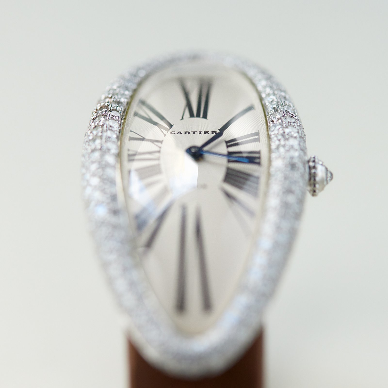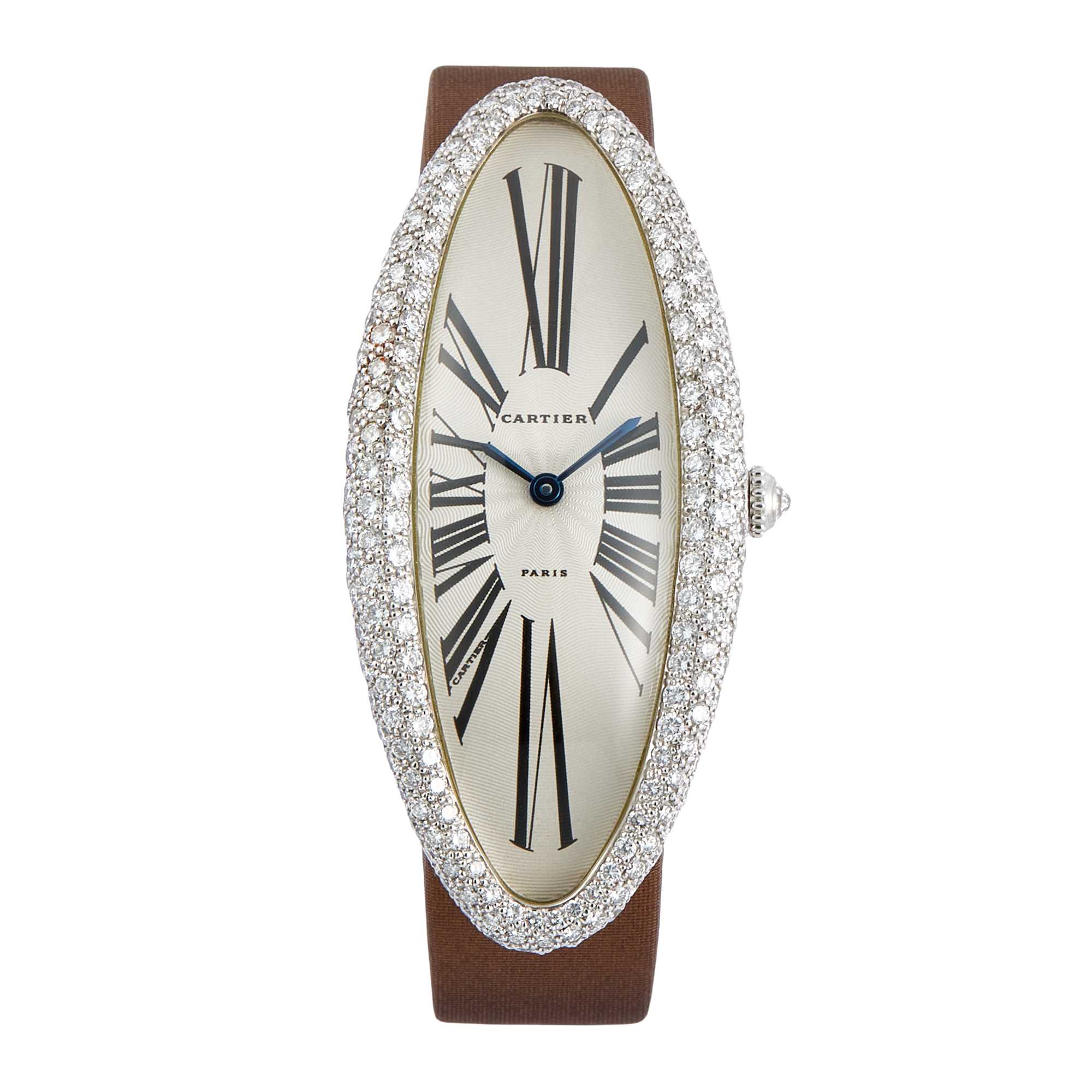 Introducing the Cartier Vintage Baignoire de Cartier White Gold Diamond Silver Dial 24mm, ref. WL406750. This refined timepiece showcases Cartier’s signature craftsmanship and iconic design. The 24 mm case is made from white gold, featuring a stunning diamond-set bezel that enhances its luxurious appeal. The silver dial is adorned with classic Roman numerals, providing clear readability while maintaining a sophisticated look. A scratch-resistant sapphire crystal protects the dial, ensuring durability. This watch is powered by a manual winding movement, reflecting traditional watchmaking techniques. It comes with a brown satin strap that complements the overall design and secures comfortably with a white gold folding clasp. With its elegant proportions and luxurious materials, the Cartier Vintage Baignoire de Cartier is perfect for those who appreciate fine watchmaking. This model is a distinctive addition to any collection, blending classic style with modern sophistication.Read More