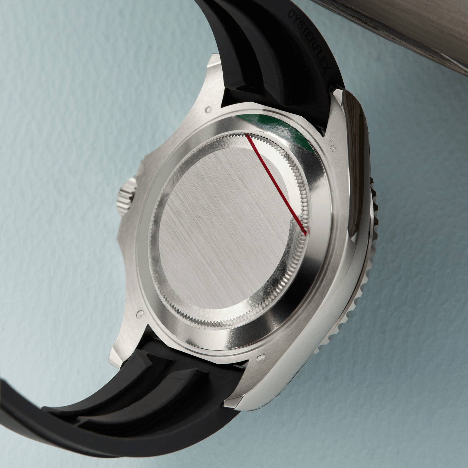Powering the Yacht-Master 42 is Rolex’s in-house Caliber 3235 self-winding movement, which boasts a generous 70-hour power reserve and 31 jewels for reliable performance. The watch is presented on Rolex’s patented Oysterflex bracelet, a sporty yet sophisticated alternative to traditional metal bracelets. The Oysterflex bracelet attaches to the watch case and the Oysterlock safety clasp by a flexible titanium and nickel alloy metal blade. The blade is overmoulded with high-performance black elastomer which is particularly resistant to environmental effects, ensuring durability and comfort on the wrist. Additionally, the bracelet is equipped with Rolex’s Oysterlock safety clasp and the Glidelock extension system, allowing for fine adjustments without the need for tools.